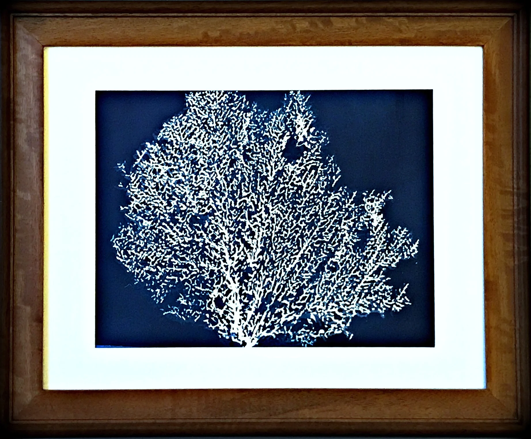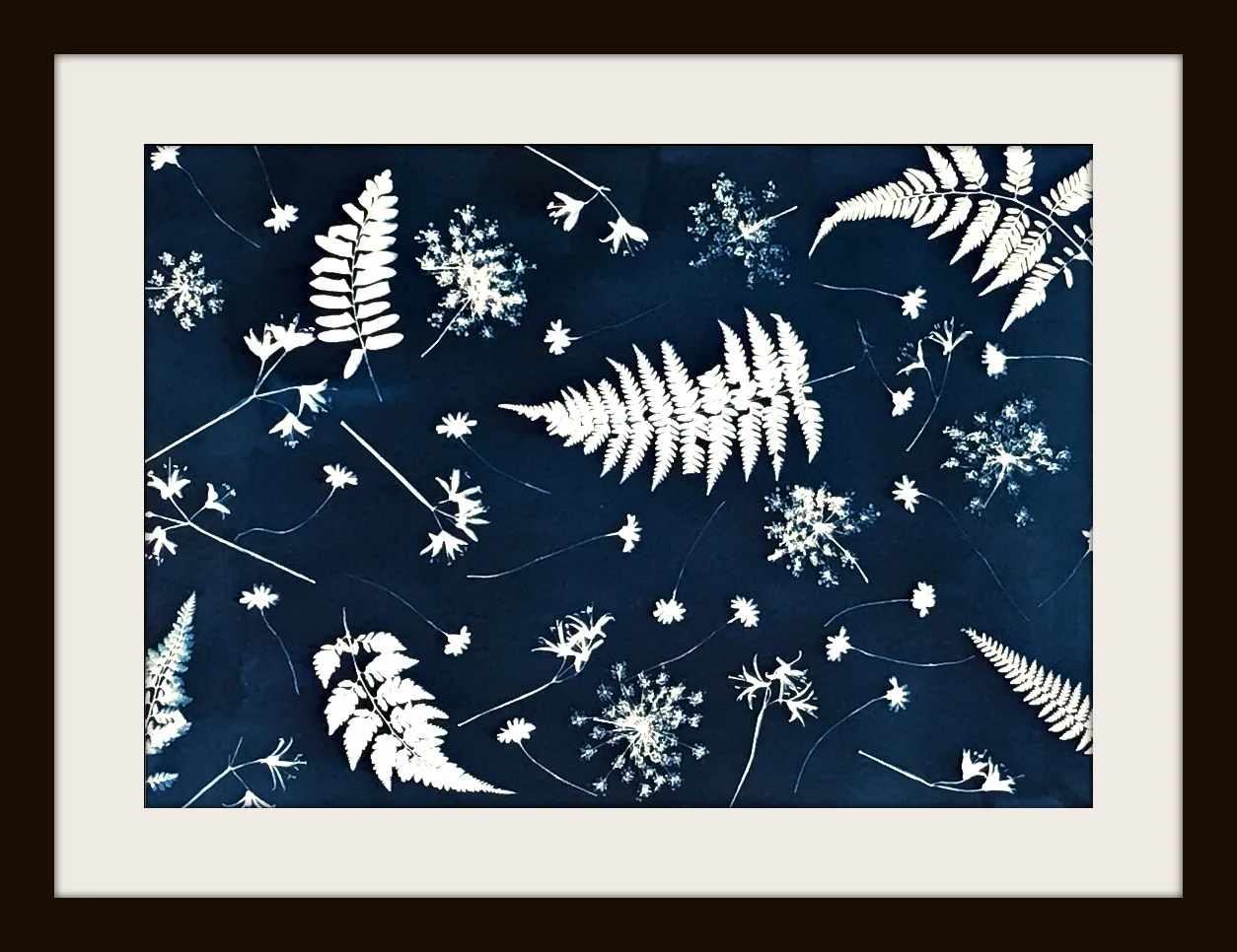The images on this page are classic cyanotypes, made very much like the first cyanotypes created in 1842. Plant material was contact printed in direct sunshine onto treated watercolor paper, then processed in the traditional manner.